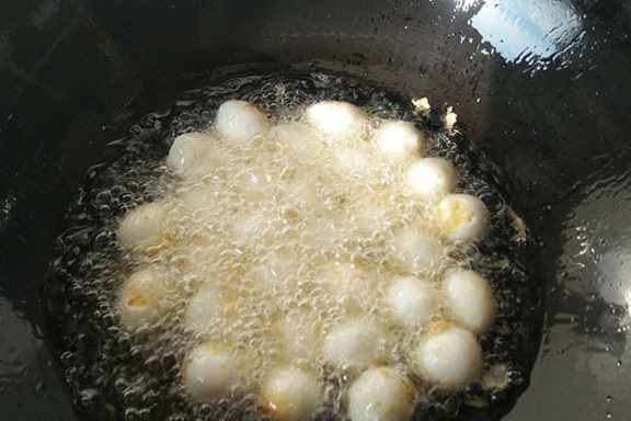 3、炸好的素雞撈出瀝幹油分,再將鵪鶉蛋下入油鍋中炸至表面起虎皮。