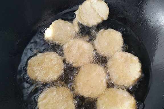 2、鍋中倒適量油燒至3成熱,然後將素雞放入鍋中小火炸至表面起泡。
