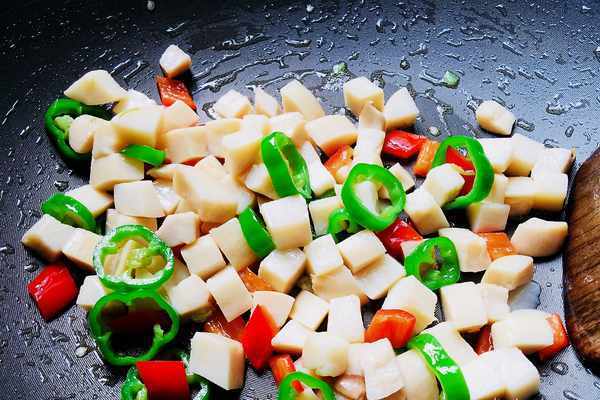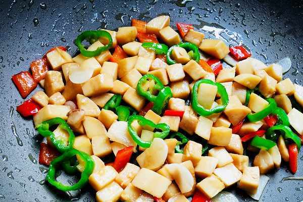 第五步:下入杏鮑菇丁,繼續翻炒30秒入味。