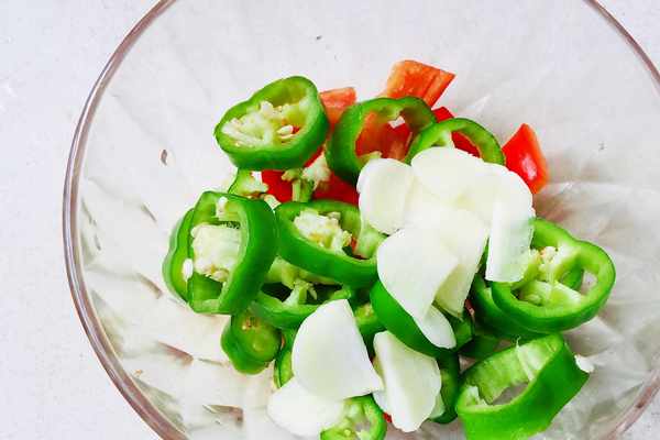 第三步:青紅辣椒洗淨切片,大蒜去皮切薄片。