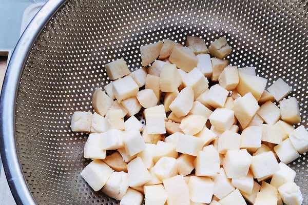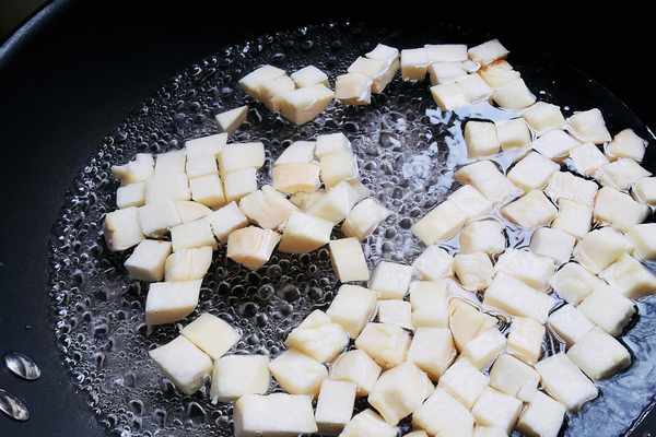 第一步:杏鮑菇洗淨切片,再改刀切為1釐米左右的小丁備用。