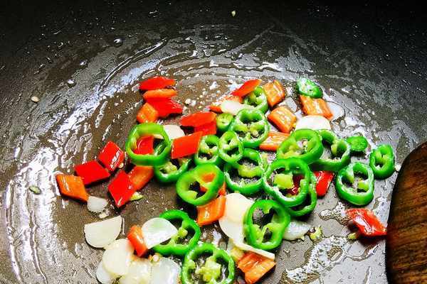第四步:炒鍋注入少許油,下入蒜片和青紅辣椒先炒香。