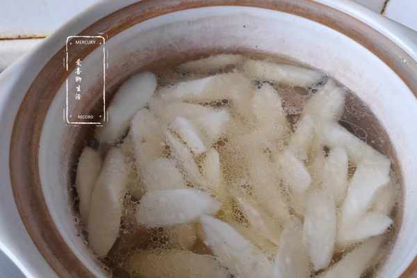 第四步加入山藥,切好山藥,骨頭湯也燉得差不多了,把山藥塊倒入湯中,大火燒開。