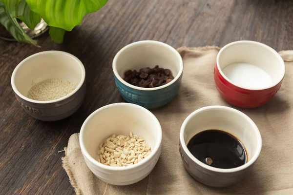 5.按照個人的口味放入紅糖漿、白芝麻、花生碎以及葡萄乾。