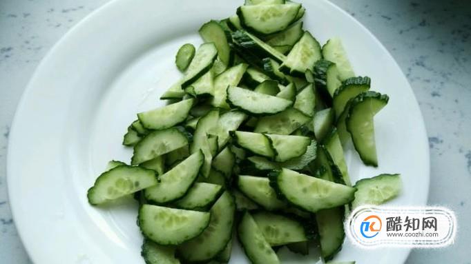 接下来可将黄瓜切片、切钉、切丝都可以,也可将黄瓜拍碎,然后再用到稍微切一切,可根据自己喜好将黄瓜切成不同的形状,然后把切好的黄瓜盛在盘子里备用!