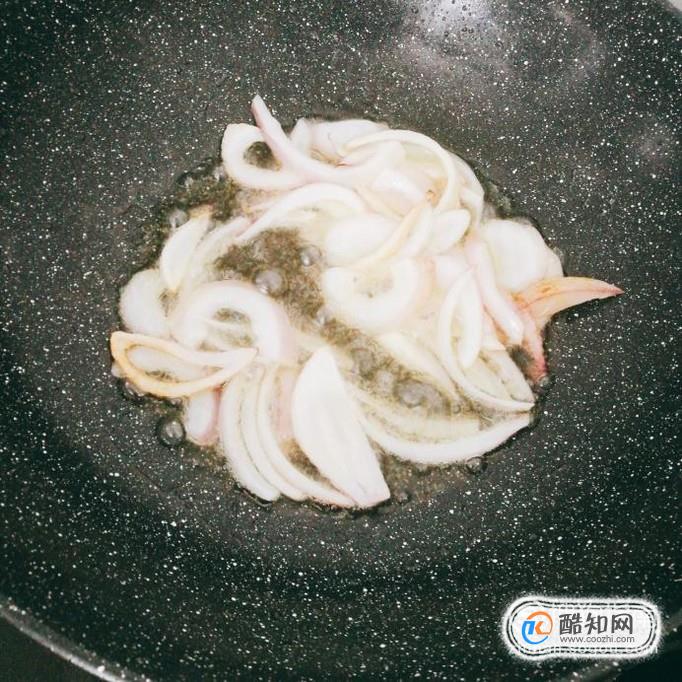 将锅底烧热后,加入橄榄油,待油温起来后,倒入洋葱翻炒。