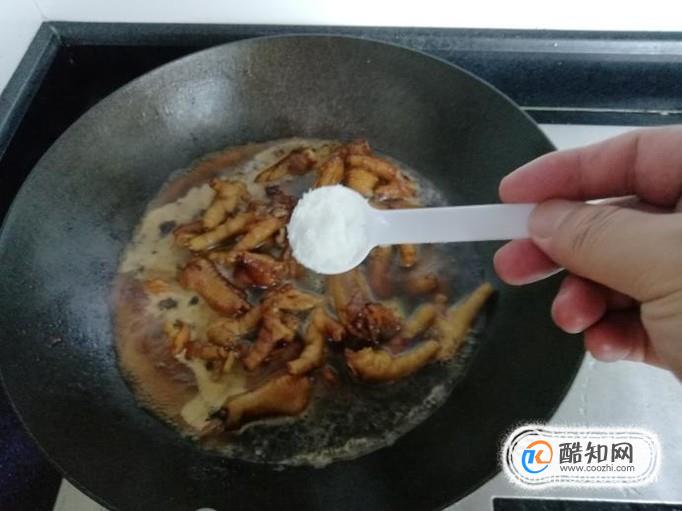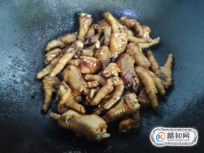 然后另起油锅,放入生姜,喜欢辣的放点干辣椒。在油温七八成热的时候,放入鸡爪迅速翻炒,然后放入黄酒,老抽上色。上色后在沿着锅边入水,再放入糖,盐调味。