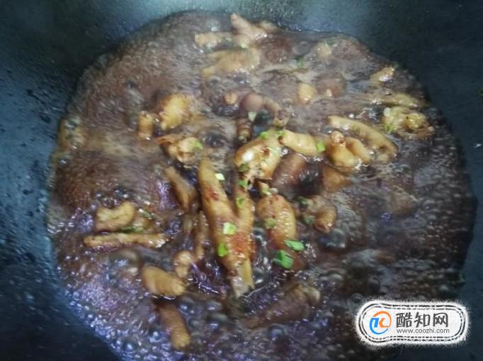然后盖上锅盖焖煮7到8分钟。如果这时候汤汁比较多的话,开大火收汁,完成以后放入葱末、少许鸡精调味,就可以出锅了。一道做法简单的家常红烧鸡爪就这样完成了,有兴趣的朋友可以在家里试试。