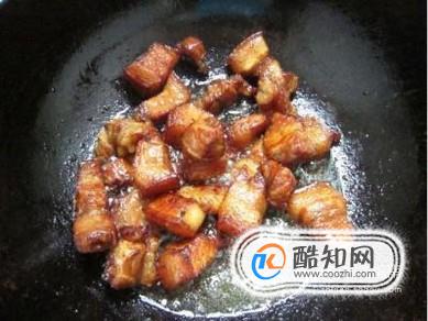 然后把煮好的五花肉捞出来控干水分,接下来把糖炒化后把煮好的五花肉裹上一层糖色,等五花肉两面金黄上色后捞出,这样子又可以控出大部分的油。