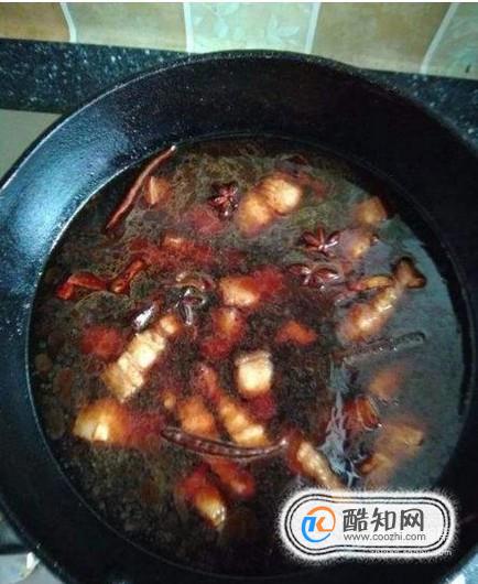 接下来把上好色的五花肉放入锅里继续煮,往锅里加入花椒粒、八角、生抽、盐入味,等五花肉到一戳就透的地步就可以了,这样子做出来的五花肉就不会很腻了。
