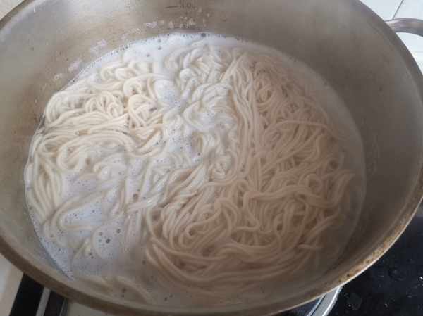 第二步:鍋裏水燒開後,把麵條抖散,放入鍋裏,蓋上蓋子煮開,用筷子劃散。新鮮的麵條一定要記住,和煮掛麵不一樣,新鮮麵條抖散煮上不用筷子攪拌,開鍋再劃散,不然就把麵條攪爛了。