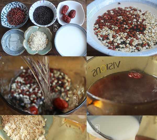 資料:紅豆20克、紫米20克、即食麥片20克、紅棗3顆、薏仁20克、冰糖4小塊、牛奶200ml
