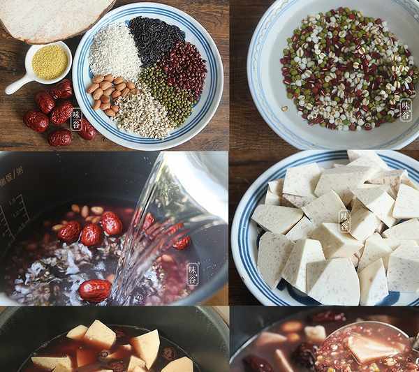 資料:芋頭180克、糯米50克、黑米50克、紅豆25克、綠豆25克、薏米25克、紅棗8顆、花生25克