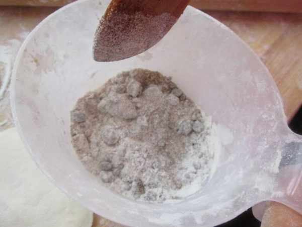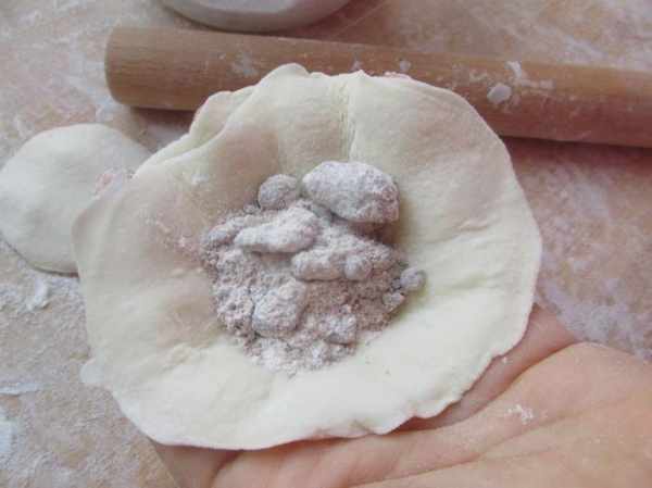 第四步:把拌好的紅糖放入到面皮上,和包包子一樣順邊捏緊。
