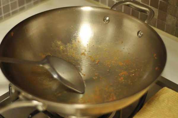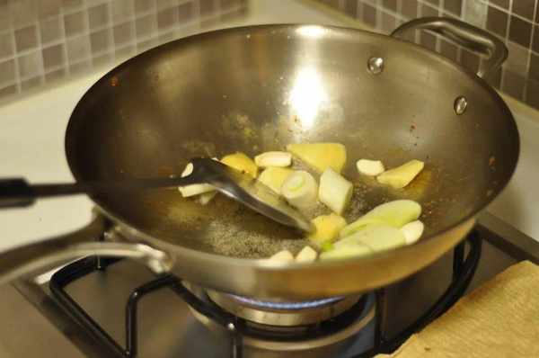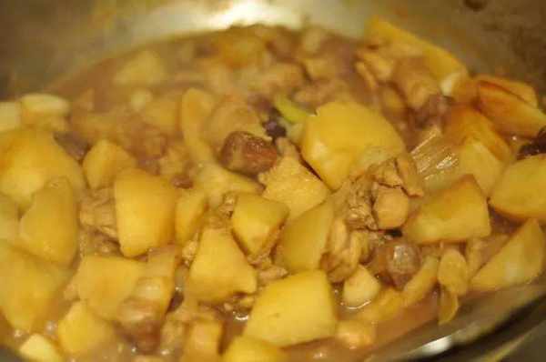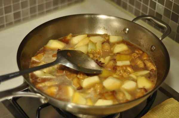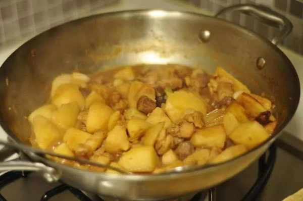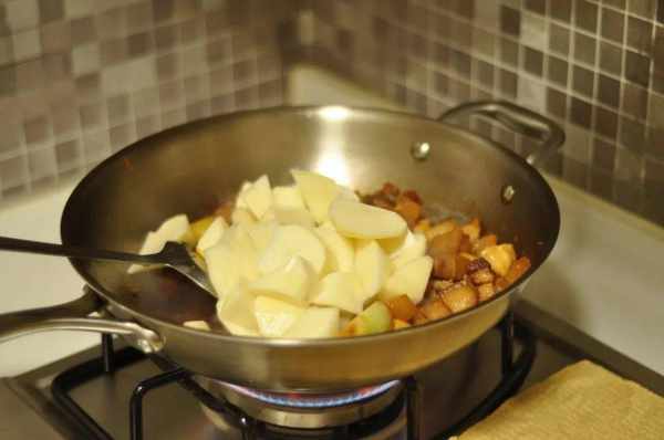 14. 煸炒幾分鐘後倒入洋芋塊一煸炒。