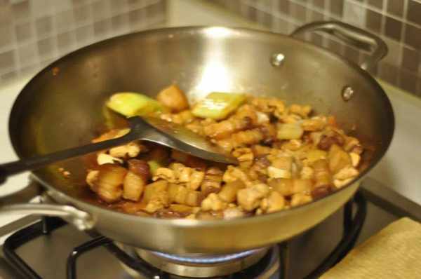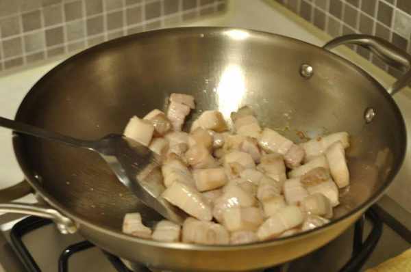 8. 油熱後轉小火倒入五花肉開始煸肉10分鐘左右,這樣防止燉好的五花肉很膩,具體煸肉時間自己把握。