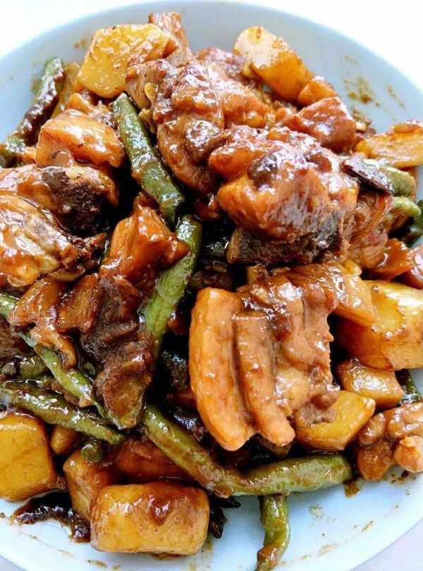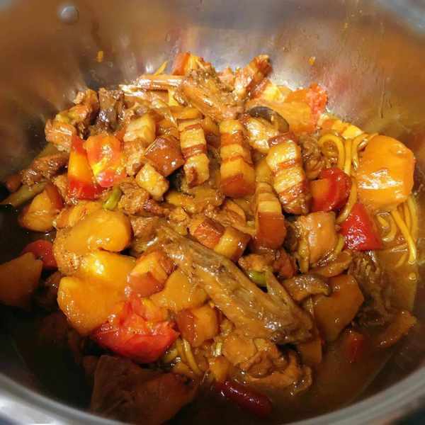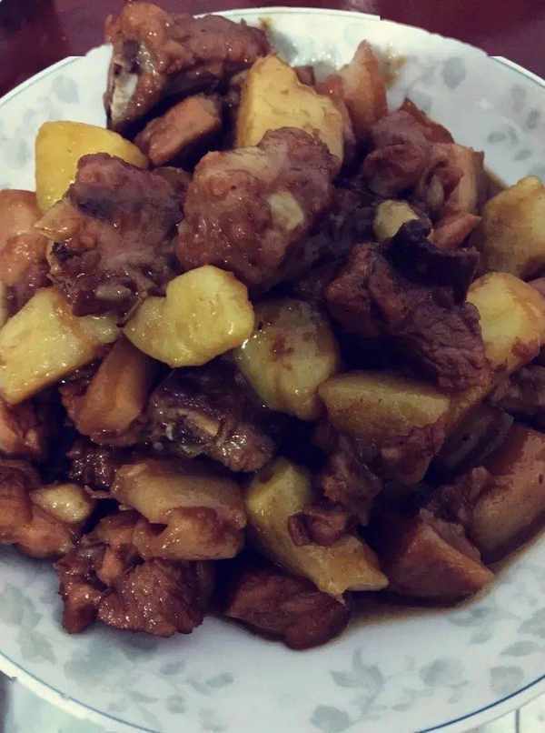 排骨肉勾雞,內蒙菜。表現北方人的豪爽。半斤五花肉,一根肋排,2只琵琶腿,一個洋芋或者芋頭。生抽冰糖黃酒,八角花椒薑。最後一點醋提味。好吃的不得了的下飯菜