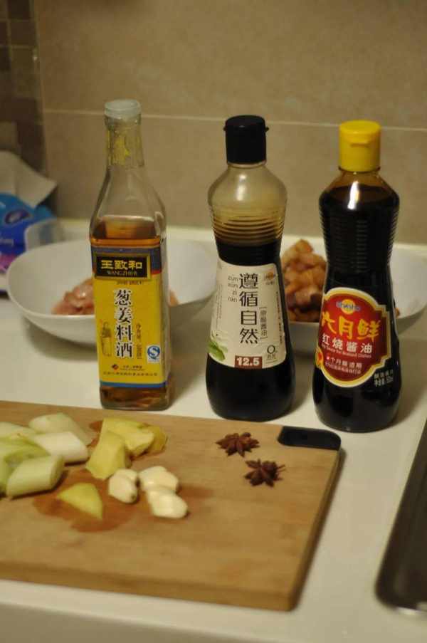 13. 將剛才的五花肉也倒進來一起煸炒,並放入兩匙醬油上色,兩匙料酒去肉腥,三四匙生抽增香及鹹味,和半匙糖提鮮,以及兩個大料瓣,如果有香葉也可以放2-3片。