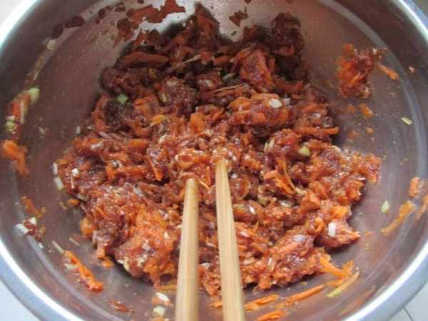 第二步:把羊肉餡中加入花椒水攪打上勁,然後加入醬油,鹽,葱末,薑末攪拌均勻,最後加入花生油拌勻。把胡蘿蔔用擦絲器擦成細絲,用刀剁幾下放入刀羊肉餡中攪拌均勻,餃子餡就調製好了。