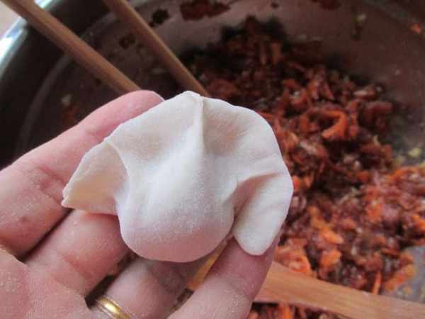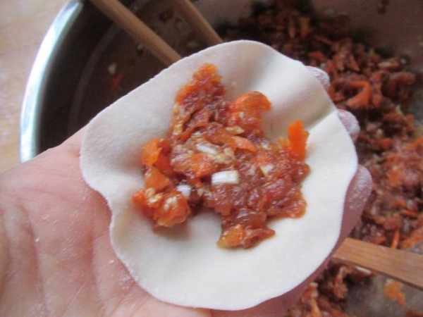 第五步:那一餃子皮,放上餡料,餡料的多少隨意即可。