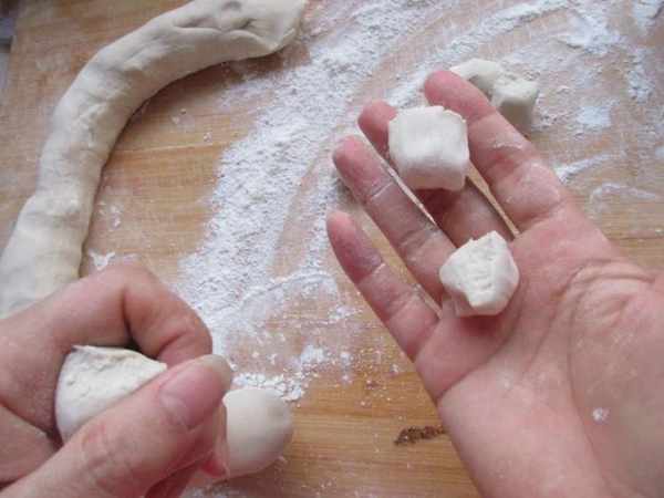 第三步:麵粉加入適量的水,和成軟硬適中的麵團,靜置一會揉勻,搓成長條,揪成小劑子。
