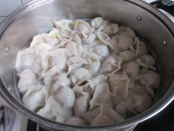 第七步:大一些的鍋裏放入水燒開,煮上餃子,用勺子輕輕的推動,這樣餃子就不會粘鍋,蓋上蓋子煮開,撒冷水,蓋上蓋子繼續煮,如此重複3次即可熟透。