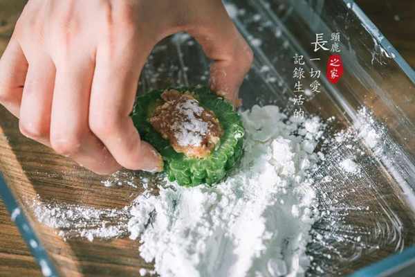 7. 苦瓜圈中抹上幹澱粉,目的是能讓肉餡粘的更穩。
