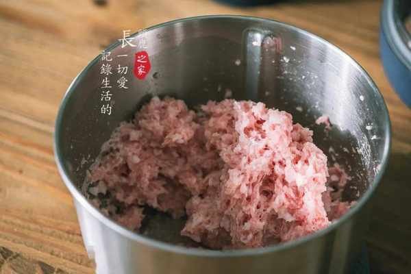 5. 用絞肉機分別把五花肉和香菇攪碎。