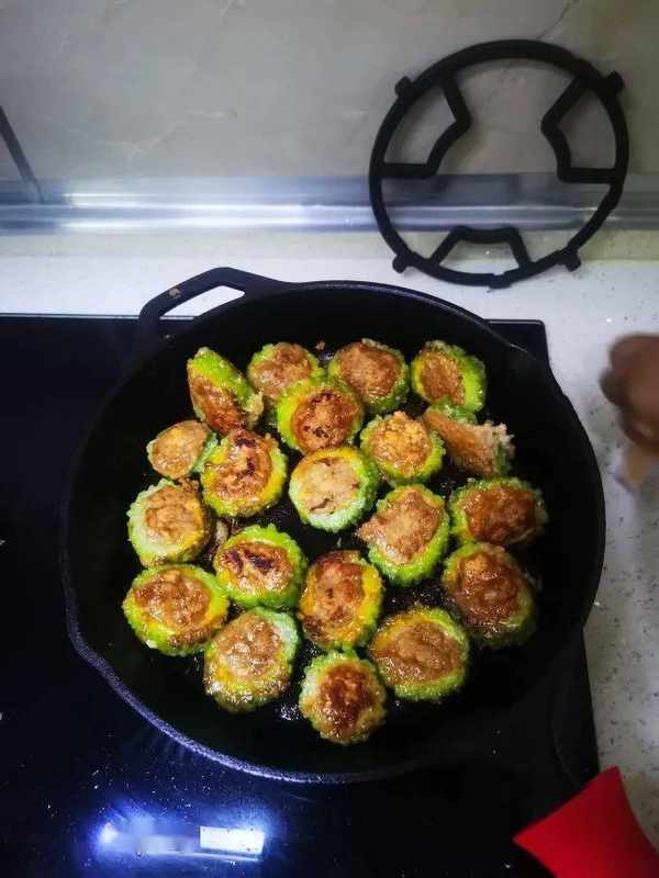 11. 鍋裏下油,油熱後放進苦瓜小火兩面煎香肉泥煎至金黃,大約8分鐘,中途記得翻面以免煎糊。