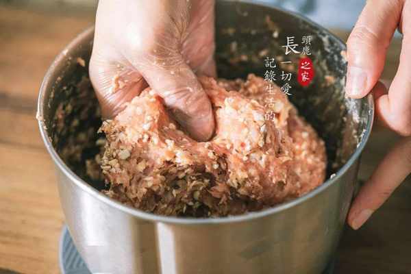 6. 香菇倒入肉末中攪拌均勻;依次加入調味料、雞蛋、玉米澱粉混合均勻後攪拌上勁後備用。