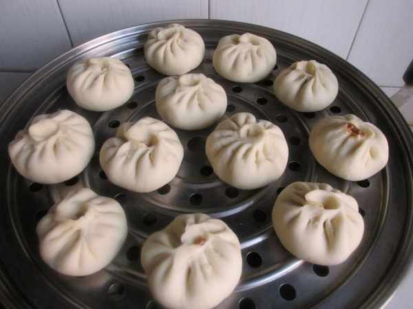 第八步:蒸鍋裏加入冷水,篦子上抹油防粘,把包子放上,大火蒸25分鐘,燜2分鐘出鍋。