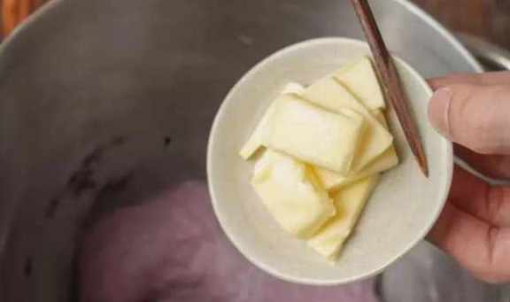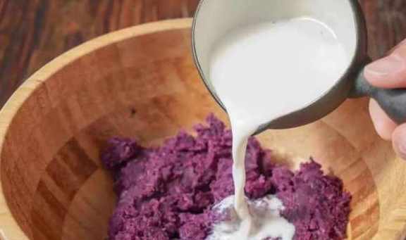1、將200g切好的紫薯片放入蒸鍋中蒸20分鐘(或包上保鮮膜入微波爐高火6分鐘),取出,用勺子壓成泥,加40g煉乳、30g牛奶和20g黃油攪勻備用。