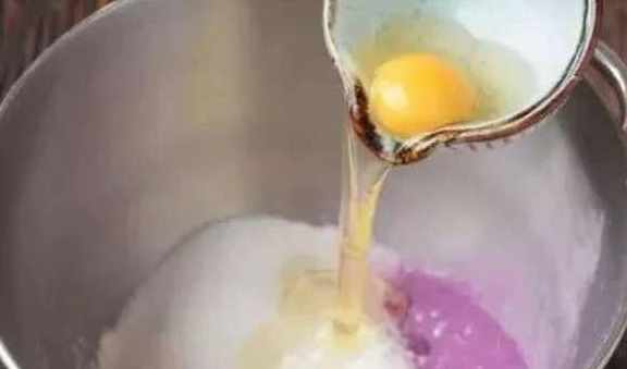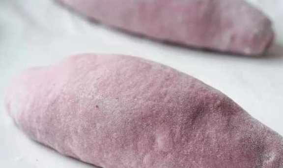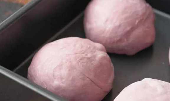 1、將250g高筋粉、20g紫薯粉、3g鹽、35g糖、5g酵母、1個雞蛋和130g水混合攪拌均勻,揉成光滑麵團。