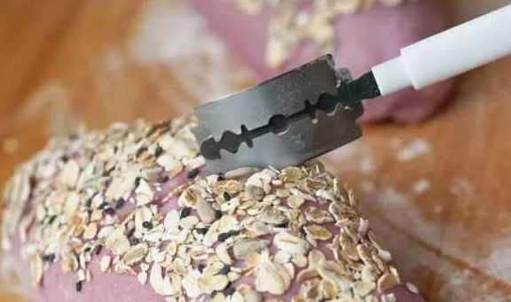 3、麵團表面噴上少量的水,滾上一層燕麥和黑芝麻,小刀輕輕劃口,室溫醒發40分鐘。