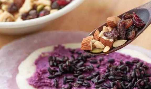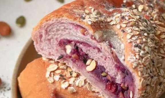 2、用擀麵杖將麵團擀成長圓形,麻薯擀開後放在麵團上,再鋪上適量紫薯泥、熟黑米、綜合堅果和果乾後,整形成橄欖形。