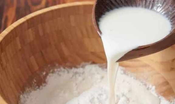 2、將100g糯米粉和30g玉米澱粉放入料理碗中,一邊倒入牛奶一邊攪拌至勻。