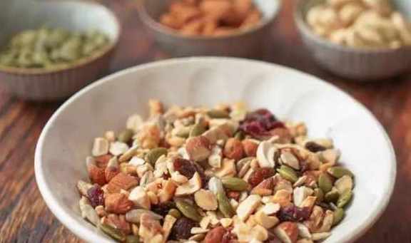 2、將適量大顆堅果切小與其他小堅果(也可換成自己喜歡的堅果類)和果乾混勻。