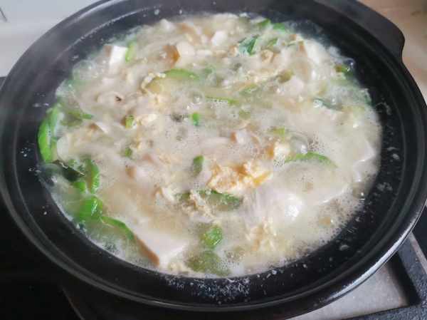 所用資料:內脂豆腐1盒,絲瓜1根,白玉菇少許,雞蛋1個,葱末,薑絲少許,鹽適量,花生油適量。