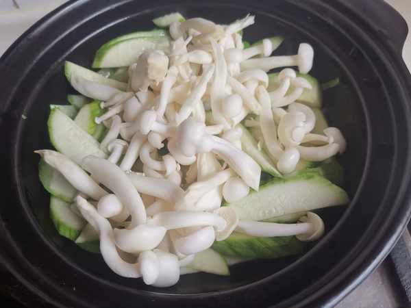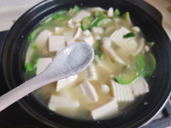 第六步:加鹽調味。鹽一定要少放一些,這樣絲瓜的甜味和白玉菇的鮮美更能體現出來。