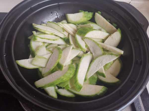 第三步:可幹燒砂鍋放入花生油燒熱,放入葱薑爆香,倒入絲瓜片煸炒。絲瓜中的維他命以及礦物質對人體非常有益,它的營養成分含量在瓜類中名列前茅。絲瓜中維他命以及B族維他命都含量較高,有利於孩子的大腦發育及中老年人的大腦健康。可以清熱祛暑,很適合這個季節,也就是應季而食。