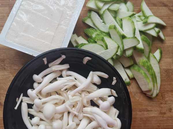 第一步:把絲瓜切片,白玉菇洗淨,內脂豆腐切塊。內脂豆腐主要由大豆製成,用葡萄糖內脂點成的豆腐叫做內脂豆腐,北方還有鹵水豆腐也就鹵水點成的豆腐,這兩種豆腐的口感不同,內脂豆腐細嫩如蛋羹,而鹵水豆腐就結實硬一些。內脂豆腐含有豐富的鐵、鈣等人體必須的微量元素,與鹵水豆腐的營養差不多。