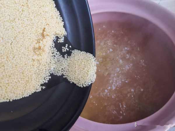 第五步:倒入淘洗乾淨的小米,繼續熬煮大約10分鐘。小米的營養價值很高,一年四季都很適合,一種極好的養胃食材,做粥更是濃稠好喝。