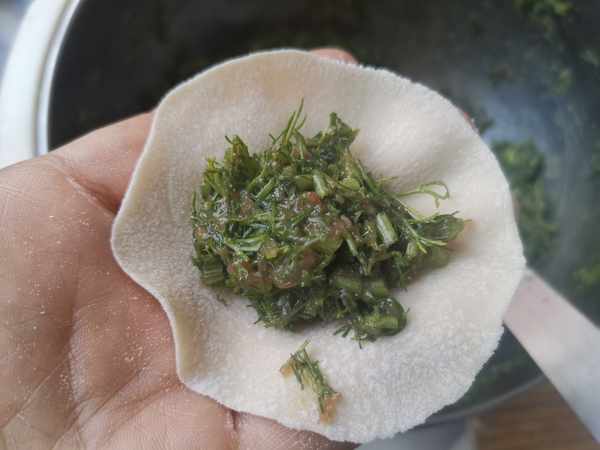 第五步:把餃子皮上放上適量的餡料,餡料的多少可以自己决定。