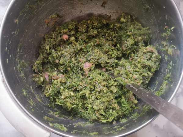 第三步:把肉餡加入醬油,鹽,花生油拌勻,再加入葱末薑末拌勻,最後加入切碎的茴香苗攪拌均勻,餡料就調好了。