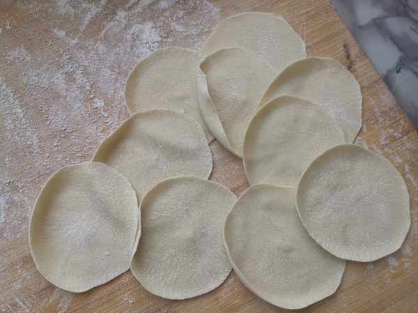 第四步:把麵粉揉勻,搓成長條揪成小劑子,擀成稍薄一點的餃子皮。