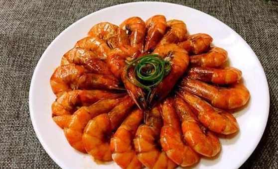 紅燒大蝦,是煙臺境內有名的一種名菜佳餚。當地紅燒大蝦的烹飪過程也很簡單,主要以新鮮對蝦為原料,製作時先將對蝦頭部的沙包去掉,抽去蝦腸用清水洗淨,再把葱薑切成片備用。然後在炒鍋內放猪油,用旺火燒至八成熱時放入對蝦,炸至五成熟撈出。之後在炒鍋內留油下葱、薑炸出香味,再放入雞湯、白糖、醋、醬油、精鹽、紹酒、味精及大蝦,用微火慢煮幾分鐘。最後取出大蝦,撈出葱、薑不用,整齊地擺入盤內,再將原汁澆在大蝦上即成。整道菜色澤紅潤油亮,蝦肉鮮嫩,滋味鮮美,一直是當地餐廳受眾最廣的菜品。