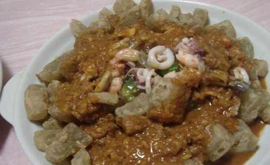 紅燒藕丸,是煙臺地區非常有特色的一種美食。它的製作工藝非常簡單,主要以鮮藕為原料,製作時先將藕削皮、切節洗淨,再用刀切成茸放在碗內,同時在碗中加入雞蛋,精鹽,味精和麵粉拌勻成餡。然後炒鍋上火燒熱,下油用大火燒至油冒青烟。之後將藕餡擠成核桃大小的丸於,放入鍋內炸成金黃色時,撈出瀝油。最後倒去鍋中油後放入少許開水,倒入藕丸上火燒沸,再加醬油和白糖蓋上鍋蓋煮開即可。成菜後具有外香內脆,鮮美可口,清淡去火等特點,一直當地群眾宴請時必備菜肴。