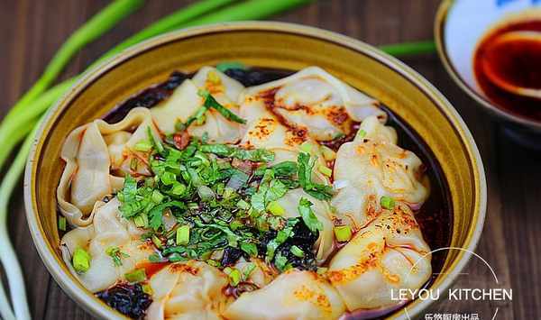 第七步:先往碗中盛2勺餛飩湯,將所有調味料都攪拌勻。然後將餛飩盛入碗中,再放入少許辣椒油,香菜末即可開動。