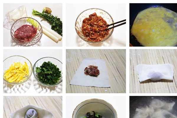 餛飩湯底:紫菜少許、香菜少許、香葱少許、提前攤好的雞蛋皮適量。