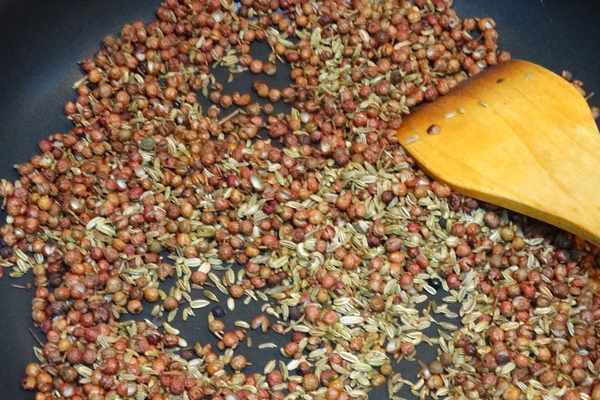 第三步:準備一個乾淨的鍋,將泡好的花椒和小茴香瀝幹水分放入鍋中,開小火開始慢慢的翻炒,此處要注意,要全程保持小火翻炒,必要時將鍋離火翻炒,防止還未炒香就已經糊掉了。